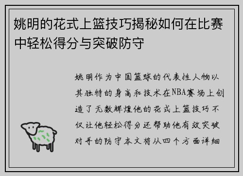 姚明作为中国篮球的代表性人物,不仅在场上展现了超凡的能力,也在场外影响着无数年轻球员。科林对姚明的深刻评价,体现了姚明在篮球界的重要地位和他所传递的积极价值观。通过分析科林对姚明的看法,我们可以更清晰地理解姚明如何从一个地方性选手成长为全球瞩目的篮球巨星,以及他对篮球运动、文化交流和社会责任感方面所作出的贡献。本文将从四个方面详细探讨科林对姚明的评价及其影响力,包括姚明的技术特点、人格魅力、文化桥...