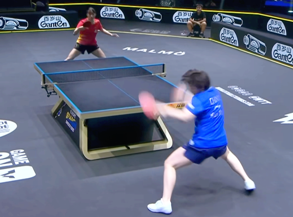 比赛开始后,蒯曼在首局打得非常积极主动,利用自己的速度优势取得9-5领先的优势,随后连丢2分稳住阵脚,10-7拿到3个局点后再得1分,最终以11-7拔得头筹,双方都有出现明显的吃发球情况,可见在场上还是有些紧张。