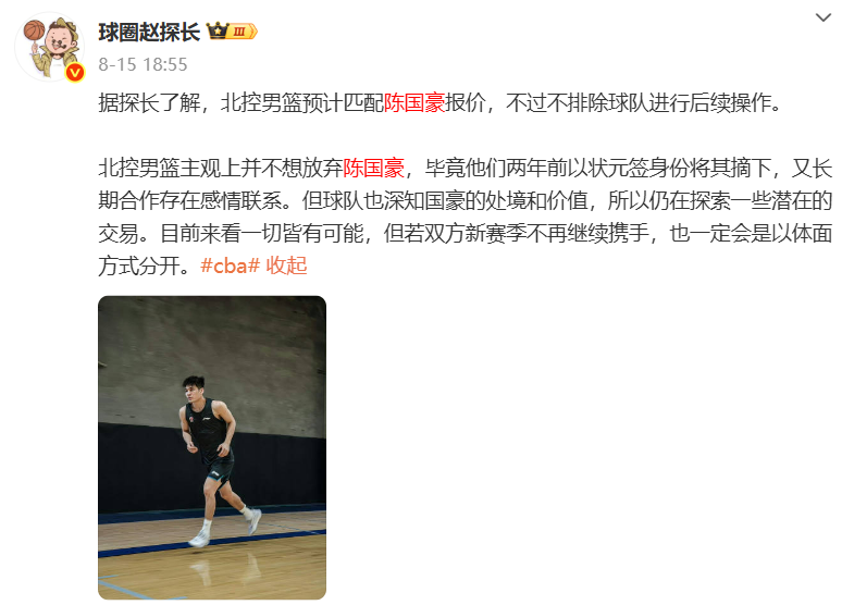 据国内知名媒体人在直播中表示,预计陈国豪将离开北控队,他的去向很快就会宣布。