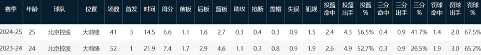 这位23届状元秀,迄今为止在CBA的两个赛季,一年级场均出战21.9分钟,贡献7.4分4.6板1.2助,二年级场均出战时间下降至14.4分钟,得到6.6分2.7板。
