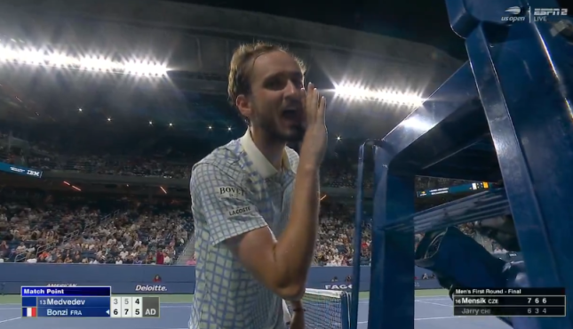 当时比赛激战至第三盘,梅德韦杰夫以4-5落后,正面临对手邦齐的盘点。就在邦齐准备二发之前,一名摄影师竟随意走入赛场。由于这一意外导致比赛中断,主裁判艾伦斯沃思决定允许邦齐重新进行一发。然而,这一判罚不仅让梅德韦杰夫怒火中烧,也引发了纽约现场观众的强烈不满。